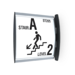 Ceiling mounted double sided sign frames supported by two cables or rods.
